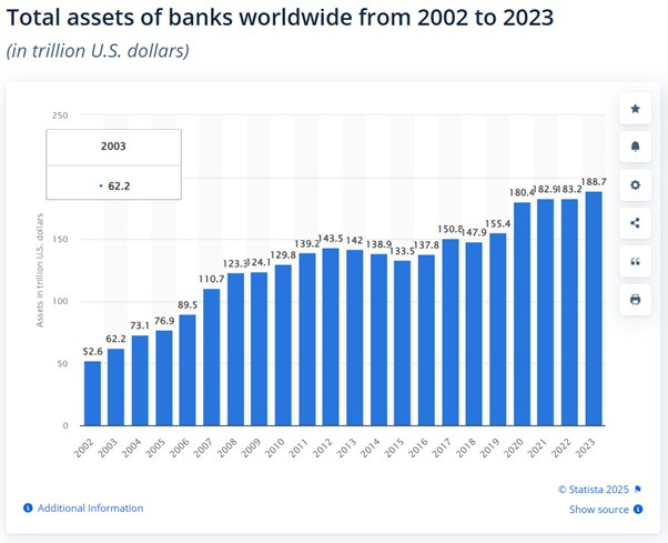 Statista (2025) Assets of banks worldwide 2002-2023. at https://www.statista.com/statistics/421215/banks-assets-globally/.